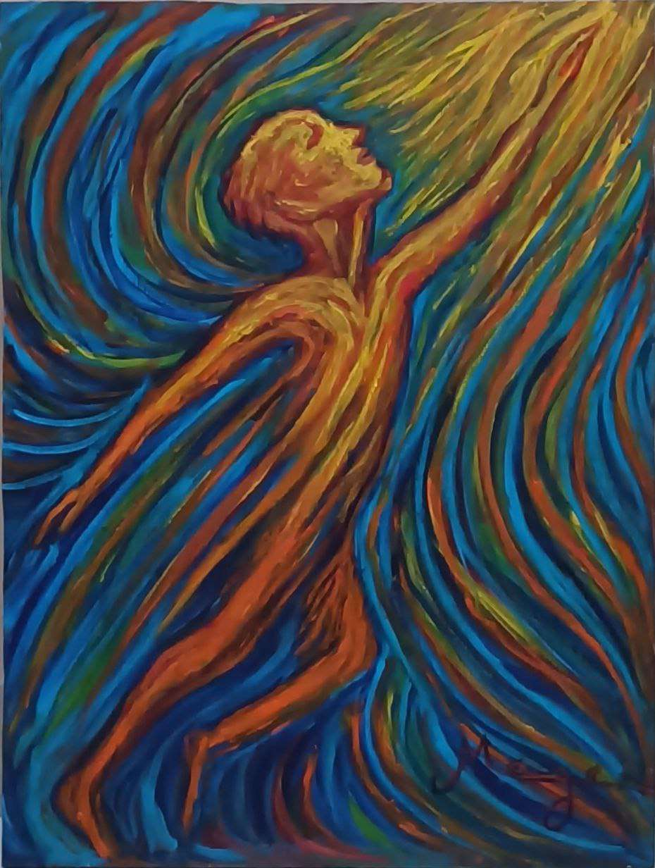 • Una figura humana en ascenso, envuelta en tonos cálidos como rojo, naranja y amarillo, que evocan fuerza, pasión y renacimiento.