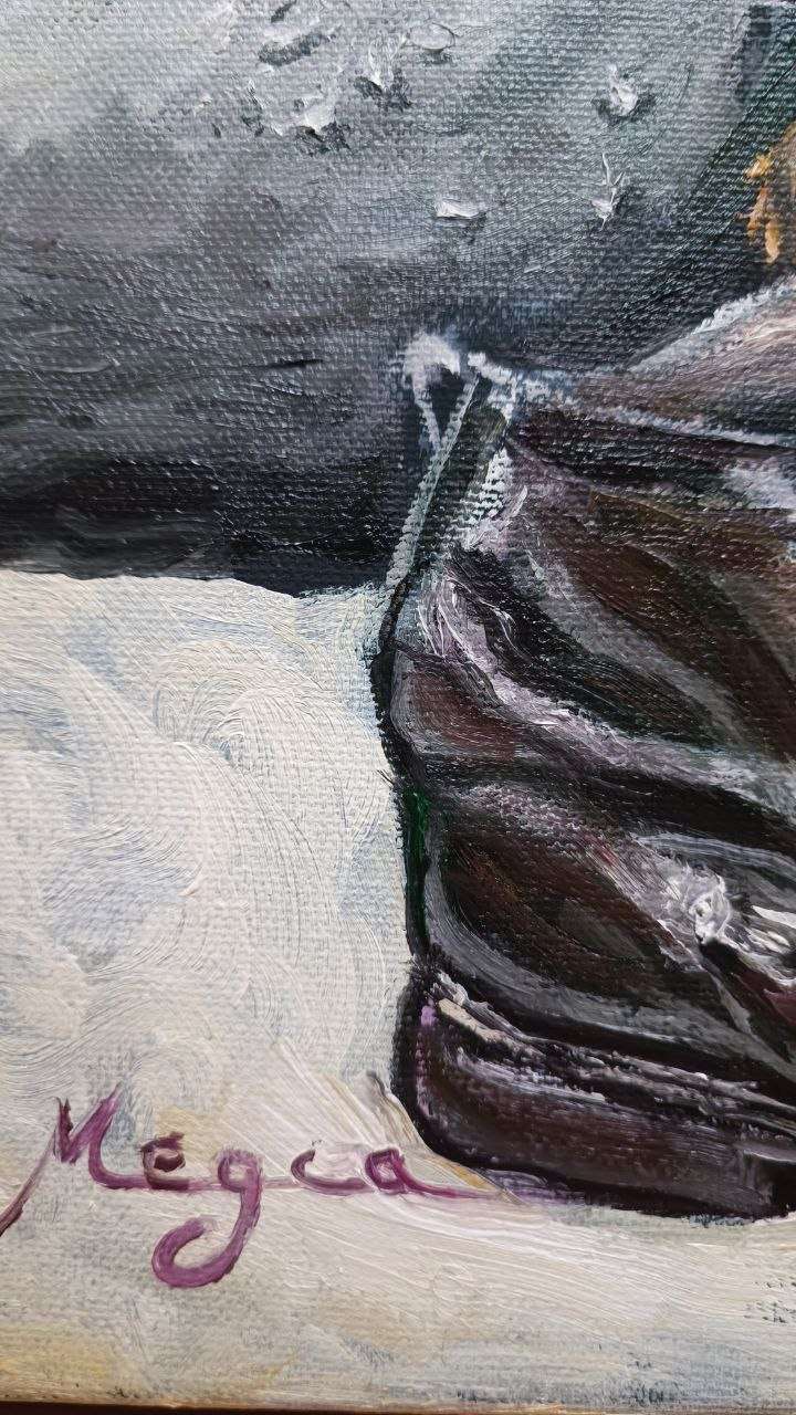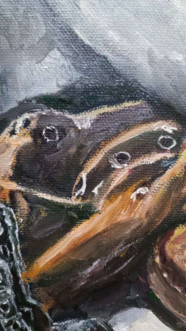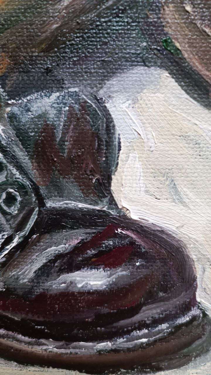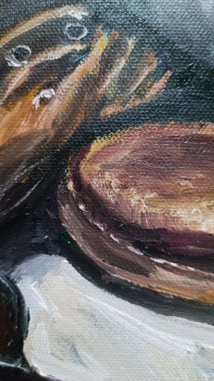 El zapato principal, desgastado y vencido por el tiempo, se presenta con una dignidad que conmueve. Sus pliegues, su rigidez, su forma deformada hablan de un cuerpo que ya no está, de un camino que quedó detenido. A su lado, otros elementos —otro calzado, un objeto circular— funcionan como ecos visuales, como capas de memoria que se superponen sin necesidad de palabras. No son accesorios: son presencias.