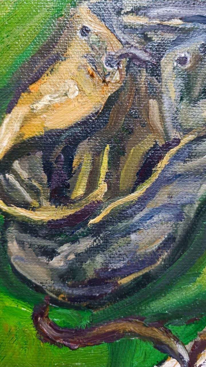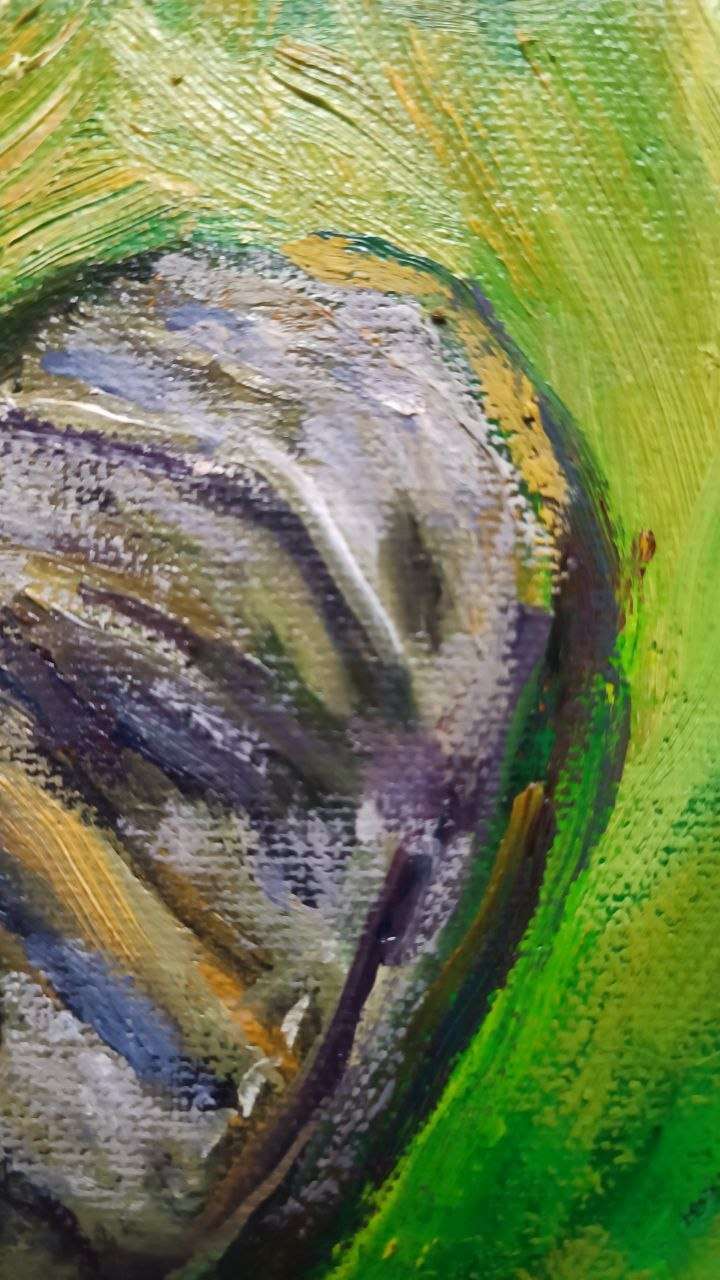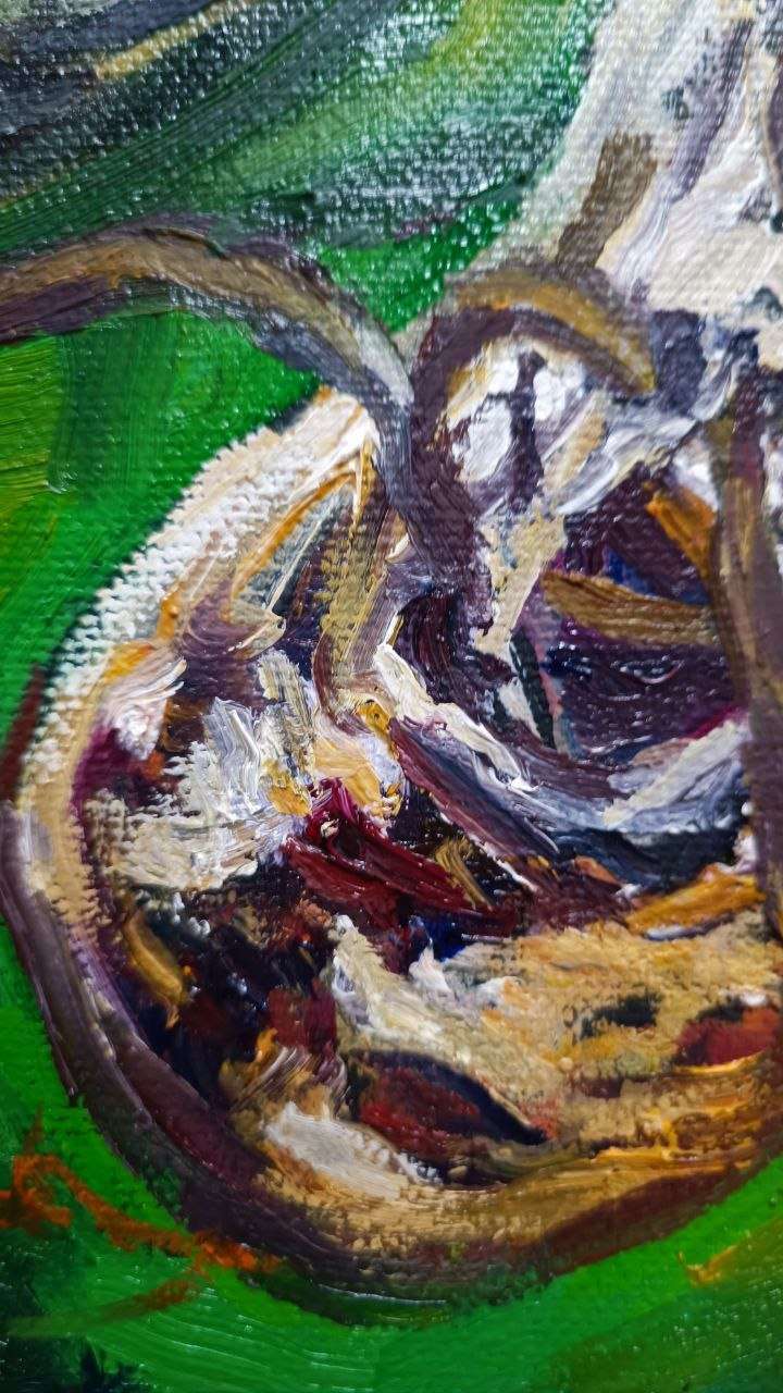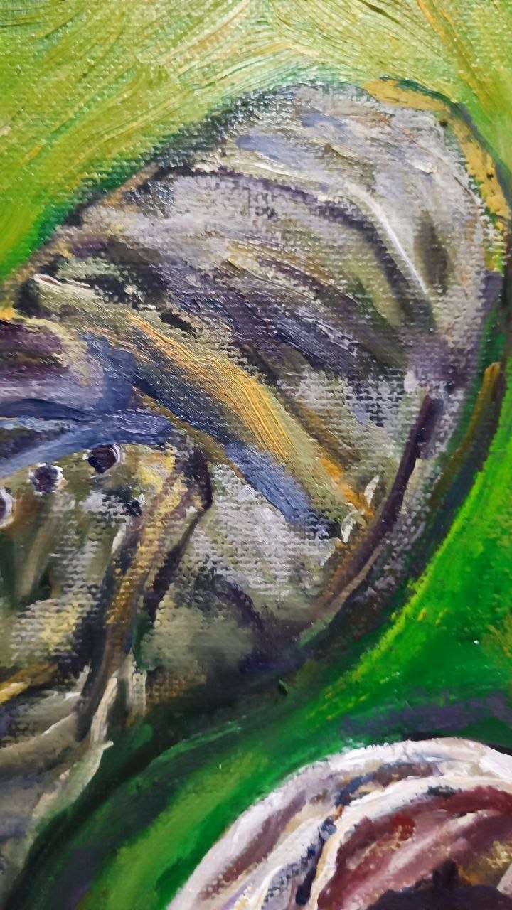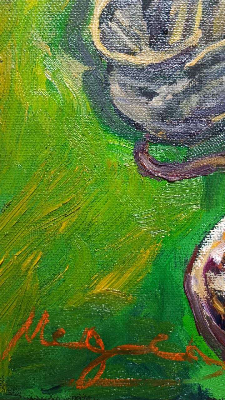 El fondo verde vibrante, lejos de suavizar la escena, actúa como un contraste emocional que intensifica la crudeza del motivo. Ese color, casi inesperado dentro de la serie, funciona como un recordatorio de que la memoria no es monocroma: es compleja, contradictoria, llena de capas. Sobre ese campo cromático, los zapatos emergen con una fuerza casi escultórica, modelados por una pincelada densa, expresiva, que subraya cada pliegue, cada desgaste, cada cicatriz del material.